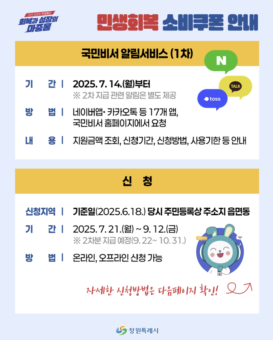 창원시 민생회복 소비쿠폰은 시민 생활 안정과 지역경제 활력을 위한 정책입니다. 꼭 신청하시고, 기한 내 알뜰하게 사용하세요!